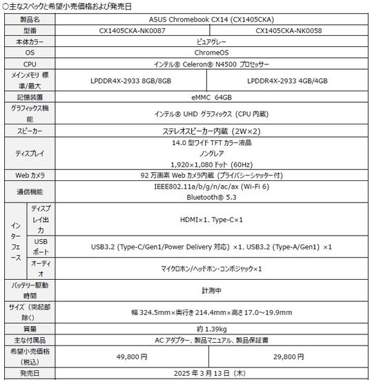 「ASUS Chromebook CX14 (CX1405CKA)」は、2025年3月13日(木)より発売を開始します。