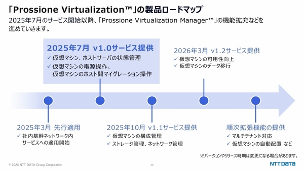 Prossione Virtualization Managerは、2025年7月の段階では、基本的な機能を備えた「v1.0」が提供される。10月には仮想マシンの構成管理やストレージ・ネットワーク管理を追加した「v1.1」、2026年3月には仮想マシンの可用性向上やデータ移行を追加した「v1.2」を提供予定で、段階を経ながら機能拡充が進められる。
