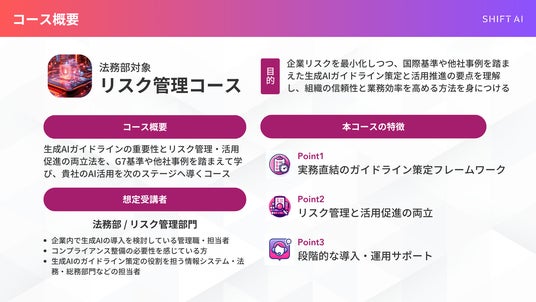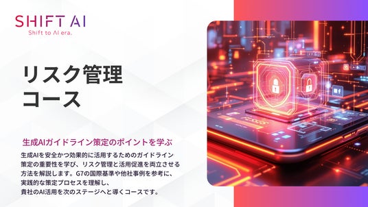 「日本をAI先進国に」を掲げAIのビジネス活用を学べるAI大学「SHIFT AI」を運営する株式会社SHIFT AI(東京都渋谷区、代表取締役 木内翔大、以下 当社 )は、DX(デジタルトランスフォーメーション)推進に必要な法人向け新サービス「リスク管理コース」を2025年3月13日より提供開始いたします。本コースは、生成AIの急速な普及に伴い、法的リスクやコンプライアンス、ブランドの信頼性確保がこれまで以上に求められる現代において、リスクを最小限に抑えながら安全かつ効果的に活用するためのルール策定の基礎を学べる内容となっています。