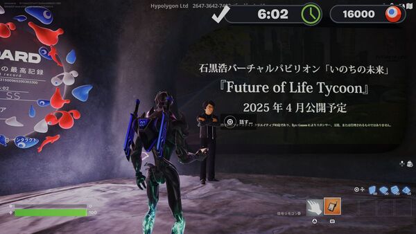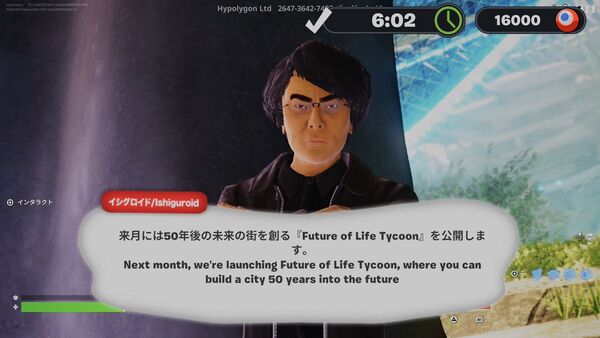 パルクールマップを抜けると、バーチャル休憩所っぽい場所に到着。そこには石黒浩氏を模した「イシグロイド」がおり、話しかけると4月に公開予定の新マップ「Future of Life Tycoon」を紹介してくれる。