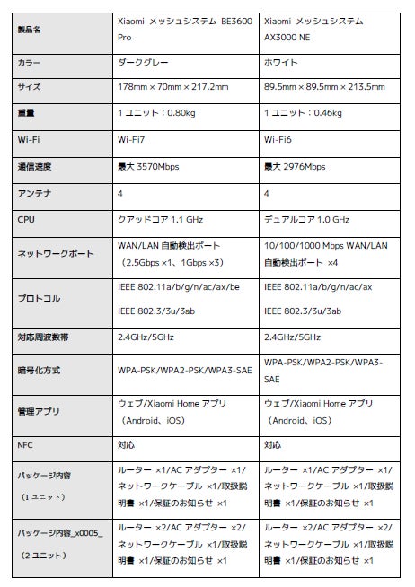 小米技術日本株式会社(以下「シャオミ・ジャパン」、本社:東京都港区、取締役社長:大沼 彰)は、Wi-Fi7とWi-Fi6に対応した高速通信メッシュシステム「Xiaomi メッシュシステム BE3600 Pro」「Xiaomi メッシュシステム AX3000 NE」をそれぞれ単品とセット両方で3月13日(木)より発売開始します。