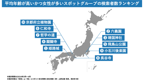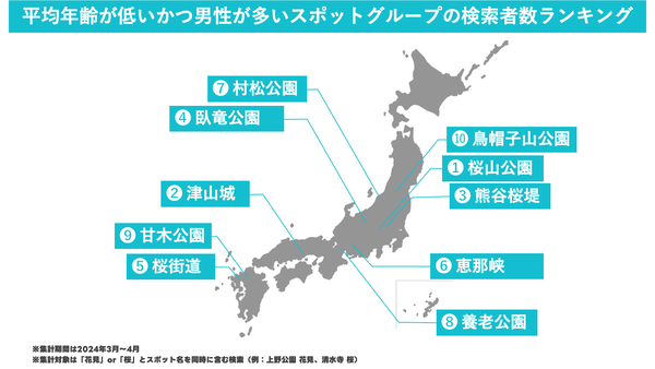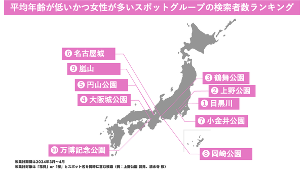また、検索者の性別・年齢層別の傾向も興味深い。平均年齢が低めで女性の多い層では「目黒川」「上野公園」「大阪城公園」など観光地としても定番なスポットが多くランクイン。
