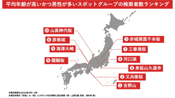 対して、平均年齢が高めで男性の多い層では「又兵衛桜」など一本桜や自然に囲まれた名所が選ばれる傾向が強いという。アクセス性や景観に対する好みが検索行動に影響していることが見えてくる。