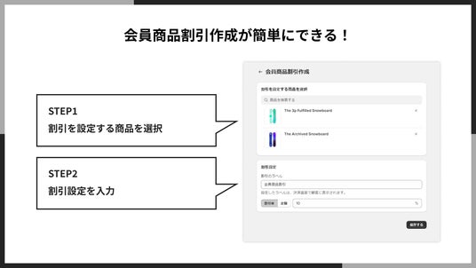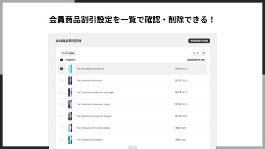 「シンプル会員初回商品割引|お手軽初回ログイン商品セール設定」では、ログイン後の初回購入で割引する商品の設定を簡単にできます。直感的な管理画面で Shopify の操作に不慣れな方でも、安心してご利用いただけます。