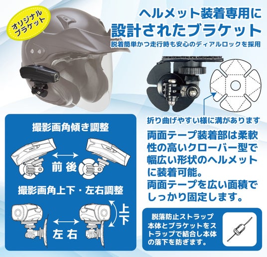 幅広いヘルメットに対応。さまざまな曲面でも取り付け可能なブラケット。クローバー型の貼り付け面は、羽部分が折り曲げることができ、しっかりと曲面を捉えて強力な両面テープで固定できます。設置するヘルメットの形状を選ばず、自由度の高い可動ジョイントで撮影画角を調整できます。
