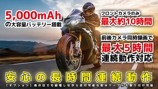 5,000mAhの大容量バッテリーを搭載し、フロントカメラのみなら約10時間、前後2カメラ同時録画で約5時間の撮影が可能。長時間のツーリングでも安心して使用でき、大切な映像をしっかり記録できます。また、オプション品の蓋つきUSBケーブルを使用すればUSB給電しながらの走行も可能となるためバッテリー容量の心配なくロングツーリングにご使用いただけます。