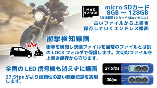 夜間走行も安心超高感度カメラSONY Starvis搭載SONY Starvisセンサーを搭載することで低照度環境でも高画質な映像を記録し、夜間走行時の見やすさを向上させます。鮮明な映像で、安全なライディングをサポートします。