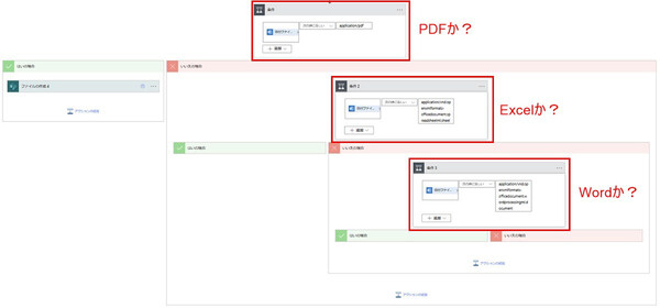 ただし「条件分岐」アクションは、ある条件に対して「はい(当てはまる)」か「いいえ(当てはまらない)」かの2択しか設定できません。第35回 のフローのように、添付ファイルが「PDF」か「それ以外」かの2択ならばこれで良いのですが、今回のように「3択(以上)の条件」になる場合は、上図のとおり、条件分岐を何度も繰り返すことになり、大変見づらいフローになってしまいます。