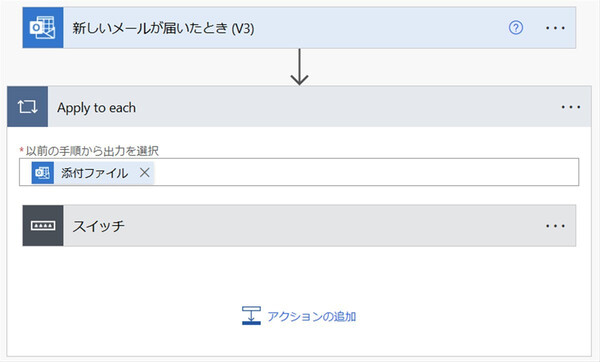 今回のフローでは、複数の添付ファイルの種類に応じて、処理を変える(保存先フォルダーを変える)必要があります。