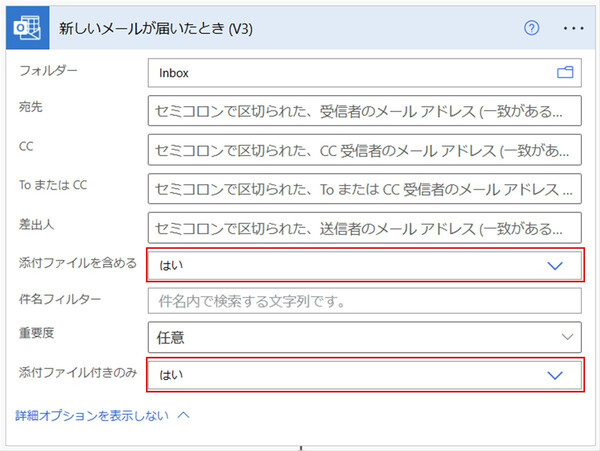もしも「添付ファイルを含める」を「いいえ」にすると、「Outlook」コネクタは、添付ファイルの基本情報(ファイル名など)だけを取得します。「はい」にすると、添付ファイルのコンテンツデータ全体を取得するようになります。