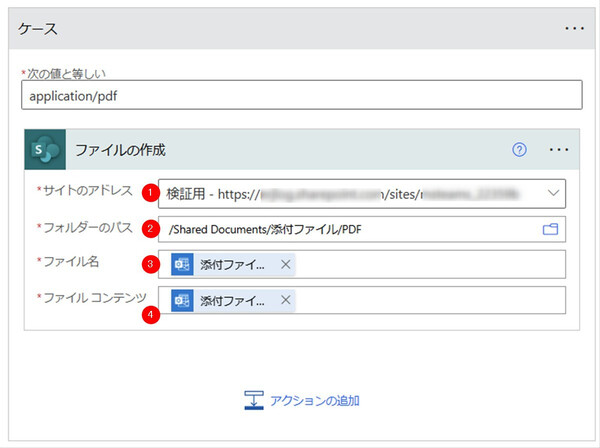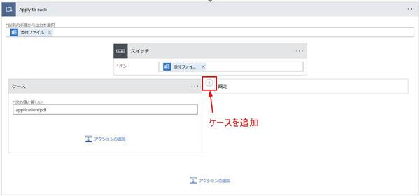 続いて、ケースの枠内にある「アクションの追加」をクリックします。ここでは、SharePointドキュメントに用意した「PDF」フォルダにファイルを保存するアクションを作成します。