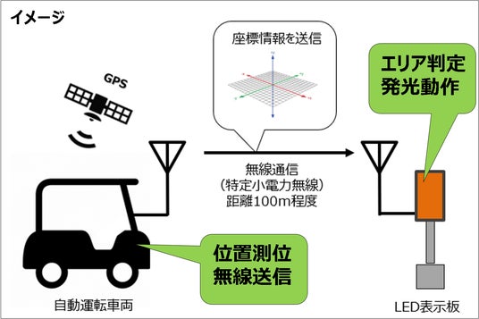 狭い路地から県道に出る見通しの悪い場所にLED表示板(オプトマーカーV)を設置、自動運転車両には、ITS技術を活用した車載機(位置測位ユニットと省電力無線通信機)を搭載し、LED表示板が車載機から送信される位置情報から自動運転車両の接近を検知し、歩行者に対しLED表示板(オプトマーカーV)を点灯して注意喚起を行います。この場所は近くに小学校があるため、ピクトやひらがなも注意喚起に使用しています。