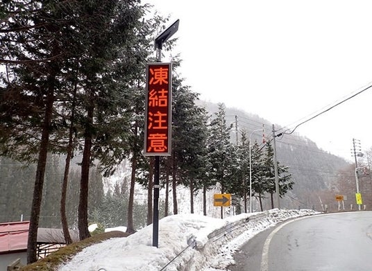今回設置のLED表示板(オプトマーカーV)は、道路状況、気象情報を文字やピクトで表示することで、歩行者やドライバーに注意喚起し、事故を未然に防止、安全をサポートします。