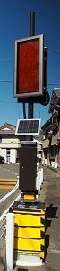 また、LED表示板をより確認していただくため、LED表示板点灯時には、下部に設置した注意喚起灯(サンデリーIII)を点灯させ、LED表示板(オプトマーカーV)の誘目性を高めております。