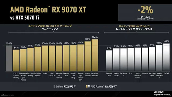 競合となるGeForce RTX 5070Tiとの比較。Radeon RX 9070 XTが2%ほど性能が低いが、ほぼ同じパフォーマンスを発揮しているといえる