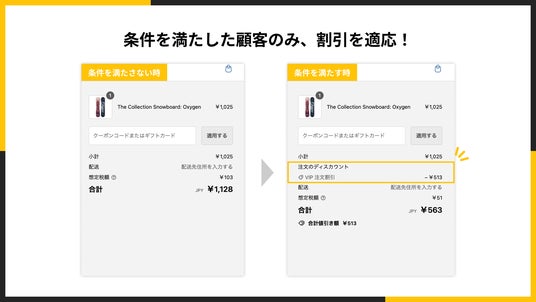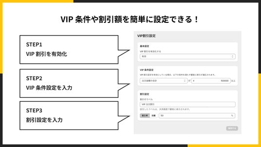 「シンプルVIP注文割引|お手軽VIP会員セール設定」を利用することで、条件にあった顧客に対する注文割引が実現できます。