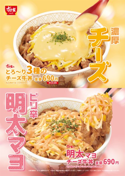 すき家は3月18日9時より、春の人気メニュー「明太マヨチーズ牛丼」の販売を開始します。価格はミニ640円、並盛690円、中盛860円、大盛890円、特盛1090円、メガ1240円。