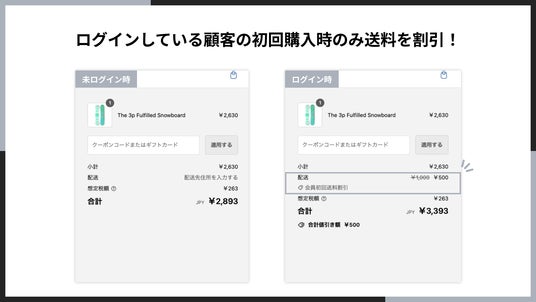 ログインしている顧客の初回購入時(右)のみ送料割引を適用