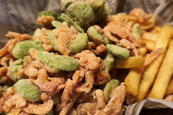 桜エビとソラマメが美しいコントラストで、エビの香ばしさと、豆の味の良さが味わえます。生を揚げるとこうなるのかと感心しながら、ビールのお供に最高の逸品です。