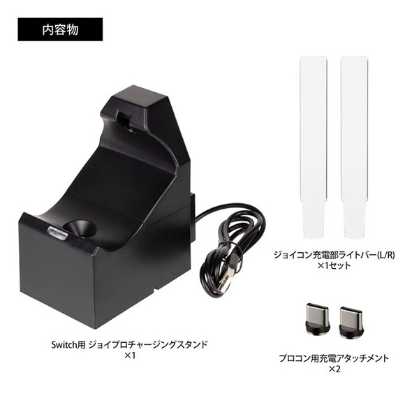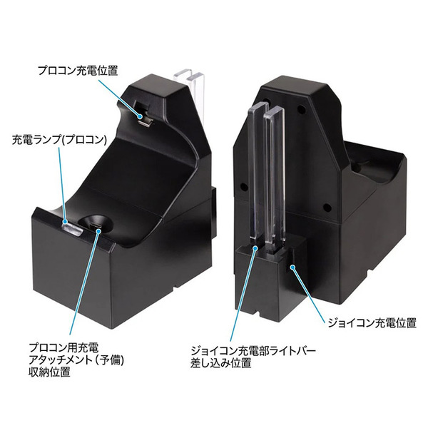 ジョイプロチャージングスタンドは、多機能設計が特徴です。プロコン充電用アタッチメントをプロコンに取り付けることで1台の充電が可能。また、ジョイコンも2台同時に充電できます。