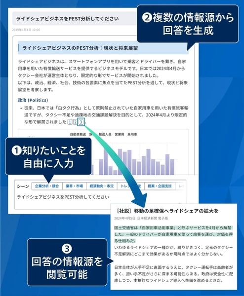 同サービスは、日経をはじめとするメディア記事や経済データを「RAG」の仕組みで参照する生成AIに対して、対話形式で知りたいことを聞くことができる情報サービス。主な利用用途としては、企業・業界調査、トレンド分析、先行事例研究などを想定。コンサルタントやリサーチを担当する企画職といったプロフェッショナル職の情報収集から企画書作成までを支援する。