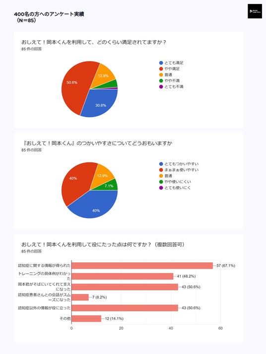 2024年10月14日に個人向けにリリースした『おしえて岡本くん!』は、サービス開始から1カ月で400名以上の方々にご利用頂いております(サブスクリプション)。また、自社アンケート(N=85名)では、81.2%の方が「利用に満足」と回答し、80.0%の方が「使いやすい」と評価頂いております。