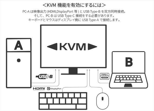 KVM機能も備え、USB Type-Aに接続したマウスやキーボードを2台のPCで共有できます。例えば、USB Type-CにノートPC、USB Type-BとHDMI(あるいはDisplayPort)にデスクトップPCをつないだ場合、映像ソースを切り替えるだけで、マウスとキーボードの主導権も自動で変わります。