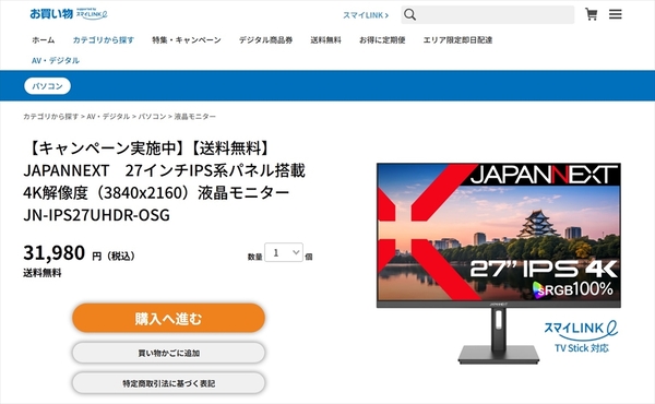 以上のように、JN-IPS27UHDR-OSGは4K27型のIPSモデルで、USB Type-Cの65W給電やKVMといった付加機能も備え、直販価格は3万1980円というコスパの良さが大きな魅力と言えます。しかも、大阪ガスのセレクトショップ(お買い物サービス)なら安く買えることもあるようで、原稿執筆時点(2025年5月14日)では直販価格より3000円安い3万1980円でした。