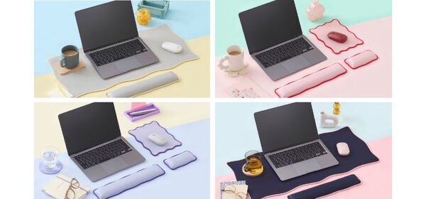 ウェーブ×バイカラーデザインのリストレストは、手首への負担を軽減するスポンジクッション付きで、スタンダードタイプとショートタイプが選べる。また、「UKIU」マウスパッドはデスクを傷から守り、縦横いずれの方向にも配置できるため、デスクレイアウトに柔軟に対応可能だ。デスクマットも同様のデザインと機能を備え、広い作業空間を確保できる。