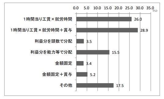 最も多いのは「1時間当り工賃×就労時間+賞与」で算出する事業所で28.9%、次いで「1時間当り工賃×就労時間」で算出する事業所が26.0%となっています。その他にも「利益分を能力等で分配」する方式や「金額固定+賞与」といった方式で算出する事業所も存在します。