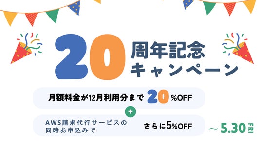 2025年12月までの月額料金が20%OFFに、AWS請求代行サービスの同時お申込みでさらに5%割引でのご契約が可能です。