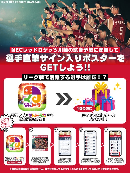 イノベーションの力で新たなスポーツ・エンターテインメントを創造し、まだ見ぬ感動と熱狂を提供するアプリ「なんドラ」を運営する株式会社なんでもドラフト(本社:東京渋谷区、代表:森井啓允)は、SVリーグ所属 NECレッドロケッツ川崎の3月22日(土)・23日(日)に開催される、ホームゲーム(KUROBEアクアフェアリーズ戦)での活躍選手と試合展開の予想を開催します。