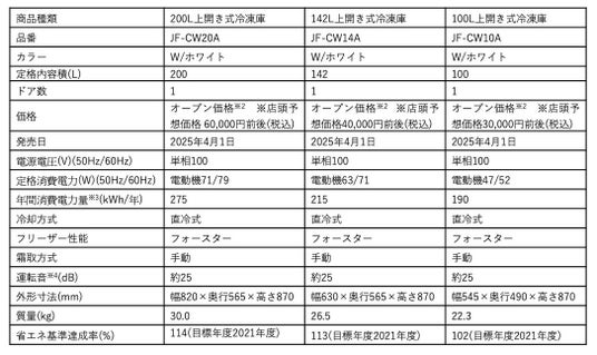 200L上開き式冷凍庫(JF-CW20A)、142L上開き式冷凍庫(JF-CW14A)、100L上開き式冷凍庫(JF-CW10A)の概要は以下の通りです。