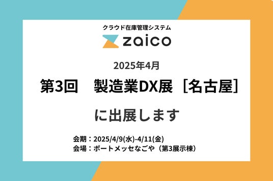 株式会社ZAICO(本社:山形県米沢市大字花沢331番地、代表:田村壽英)が提供するクラウド在庫管理システム「zaico」は、2025年4月にポートメッセなごやで開催される大型展示会 ものづくりワールド名古屋の「第3回 製造業DX展[名古屋]」に2025年4月9日(水)~4月11日(金)の期間、出展いたします。