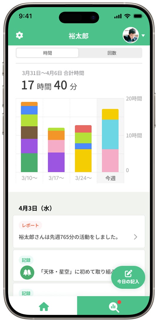 また、記録データはグラフやフィードとして自動で整理・可視化され、子どもの興味や得意分野の傾向がひと目でわかるようになります。直感的に操作できる選択式の入力画面で、忙しい日常でも手軽に続けられます。記録されたデータはグラフやタイムラインで可視化され、子どもの興味や成長の傾向が一目で分かります。