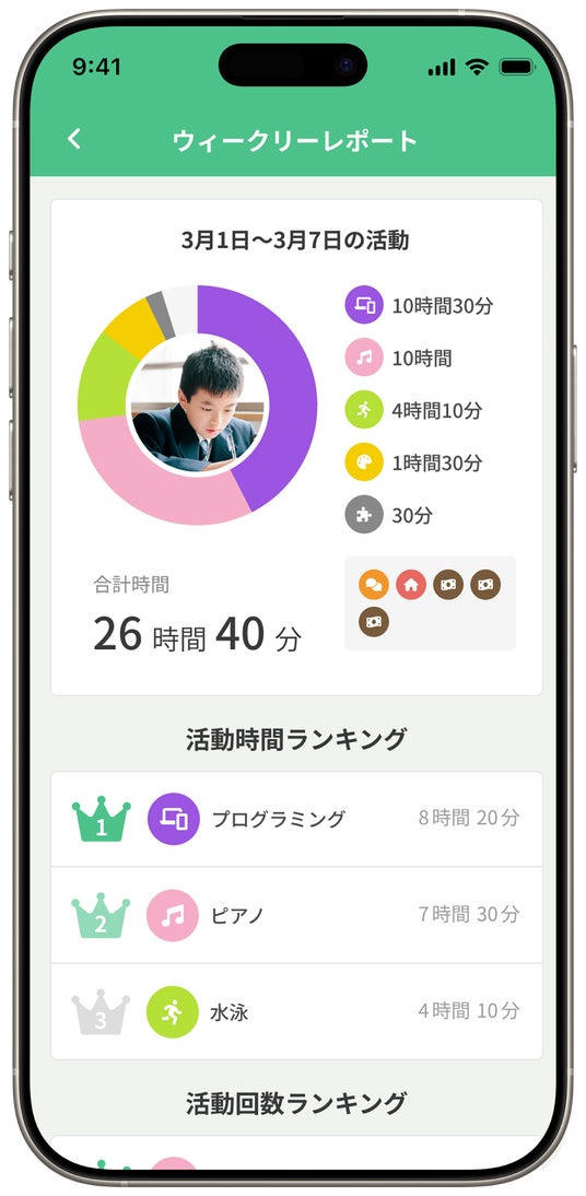 お子様の活動を集計し、グラフで可視化することで、成長の傾向や新たな強みに気づくきっかけになります。成長に繋がる変化があると通知され、親としての不安を軽減します。