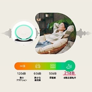 お部屋の雰囲気に合わせて切り替えられる8色ムードライト*12が、ゆったりとしたリラックス空間を演出。また、いつでもどこに置いても、暮らしの邪魔をしない静音設計も特長です。スリープモードに設定した場合は、木の葉がふれあう程度の音と言われる21dBで運転し、就寝時にも眠りを妨げることなく、空気をキレイにします。