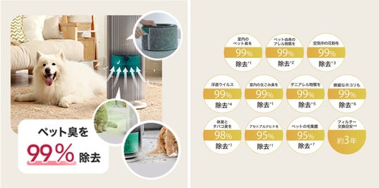 *1 試験方法:1㎥の密閉した試験空間で日本電機工業会 自主基準( JEM1467 附属書 B「脱臭性能試験」 )の性能評価試験にて実施。臭気成分:1.ペット臭・生ごみ臭を想定したアンモニア、2.体臭・タバコ臭を想定した酢酸と3.アセトアルデヒド。試験結果:ペット臭99%、生ごみ臭99%、体臭98%、タバコ臭98%、アセトアルデヒド95%( 30分後の除去結果 )、風量4、ブースターモード、首振り無しで実施。試験機関:暮らしの科学研究所株式会社 。試験報告書:LSRL-21010-H139。認証日付:2024年11月20日。脱臭効果は周囲環境( 温度・湿度 )、運転時間、フィルターの使用期間・劣化状況、臭気によって異なります。密閉した試験空間での効果であり、実使用空間での実証結果ではありません。