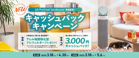 この度の「LG PuriCare(TM) AeroBooster」の発売を記念して、本日2025年3月18日(火)より、対象の空気清浄機をご購入いただいたお客様向けのキャンペーンを実施いたします。