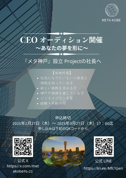 そして、本プロジェクトの特色の一つとして、「メタ神戸」の社長をオーディション形式で募集することが発表されました。これにより、次世代のリーダーとなる人材を発掘し、メタバースを活用した地域振興に新たな視点を取り入れていく方針です。オーディションの詳細については、今後発表予定となっており、多くの方の挑戦が期待されます。
