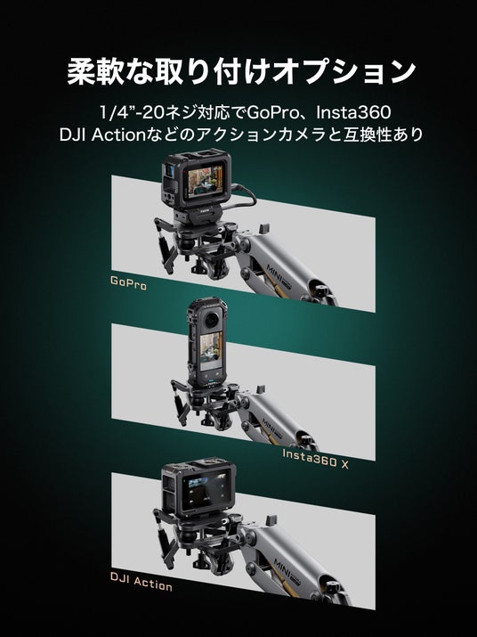 「Hydra Alien Mini用ユニバーサル衝撃吸収ヘッド」は、GoProやInsta360をはじめ、さまざまなアクションカメラに最適化されており、どんな撮影スタイルにも対応可能です。さらに、1/4"-20ネジとNATOインターフェースを搭載しており、三脚やジンバルなどの他の機材と簡単に接続できます。