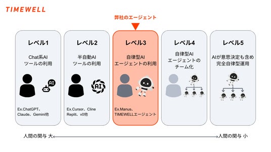 弊社のTIMEWELL AGENTは、自律的に作業を修正しながら実行し、エラーからも復帰できる機能を有し、レベル3相当の機能を有します。また、他のAIエージェントと組み合わせて利用することでレベル4クラスの運用も可能となっています。