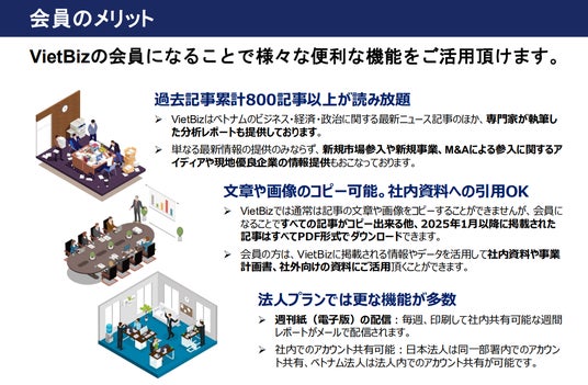 VietBizのリニューアルされた会員サービスは、ベトナム市場進出に不可欠な情報を提供し、企業のベトナムビジネスを加速させます。新しい料金プランとサブスクリプション型サービスを活用し、必要なベトナムの経済情報をすぐに取得できる環境を整え、ビジネス成功を実現します。
