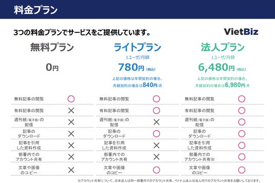 ・法人プラン:ライトプランに加え、週刊誌(電子版)の配信、記事を引用した資料作成、請求書払い、部署内でのアカウント共有が可能。