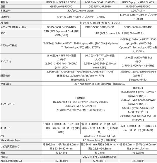 ASUS JAPAN株式会社は、ASUSのゲーミングブランド「Republic of Gamers(ROG)」より、圧倒的なグラフィックパフォーマンスを誇る新しいGPU、NVIDIA(R) GeForce RTX(TM) 5080 Laptop GPUを搭載した、ハイパフォーマンスゲーミングノートPC「ROG Strix SCAR 18 G835LW」および「ROG Strix SCAR 16 G635LW」と、薄型軽量でスタイリッシュなプレミアムゲーミングノートPC「ROG Zephyrus G16 GU605CW」、3製品の予約開始を発表いたしました。2025年4月9日(水)発売開始となります。