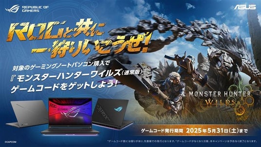 本製品の発売を記念して、対象のゲーミングノートPCを購入いただくと先着で「モンスターハンターワイルズ(通常版 / Steam版)」のゲームコードがもらえるキャンペーンを実施いたします。(700個・先着順 なくなり次第終了となります。)詳しくは別途キャンペーンサイトをご確認ください。