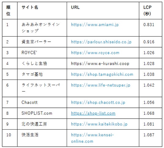 - 1秒の壁を突破する重要性:今回の調査で特筆すべきは、トップ10のサイトすべてがLCP(Largest Contentful Paint)1.1秒以下を達成していることです。「あみあみオンラインショップ」を筆頭に、資生堂パーラー、ROYCE’といった各業界を代表するサイトが、驚異的な表示速度を実現しています。