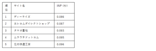 今回のトップは、前月5位だった「ディーライズ」になりました。「ディーライズ」は前々月にもINP0.084秒で首位となっており、常に高いパフォーマンスを保っております。