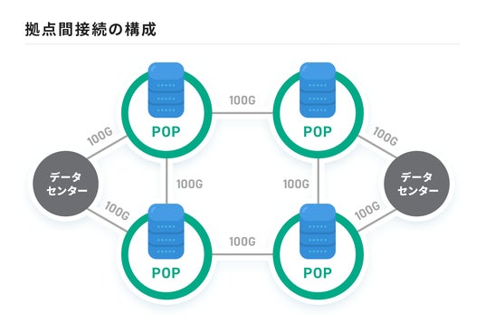 当社のバックボーンネットワーク内におけるPOP(Point Of Presence=インターネットや通信ネットワークの接続拠点)についても、従来の東京・大阪2拠点に加えて新たに2拠点を開設し、計4拠点体制を構築しました。これにより、いずれかの拠点で障害が発生しても他の拠点でバックアップを行うことで、安定したサービス提供が可能になります。さらに、全拠点およびデータセンター間を100Gbps専用回線×2の構成で接続。効率的なデータ伝送を実現するとともに、高い冗長性と信頼性を確保しました。
