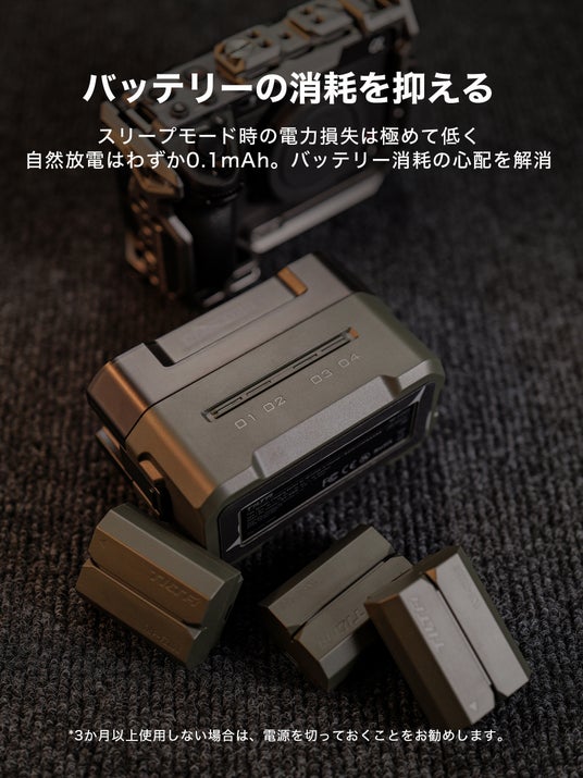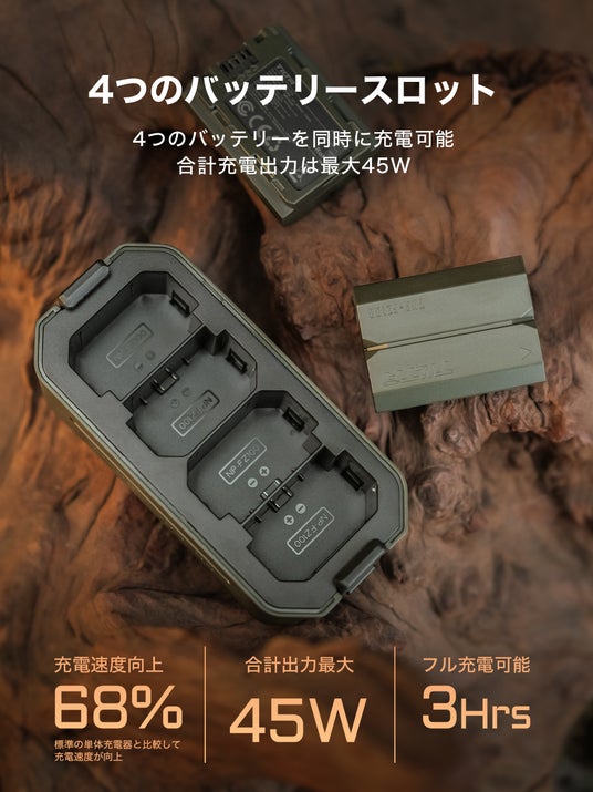 TILTAの「ポータブル4連充電器」は、最大4本のNP-FZ100バッテリーを同時に充電できる高性能充電ステーションです。45WのPD(パワーデリバリー)高速充電に対応し、わずか3時間で4本のバッテリーをフル充電。